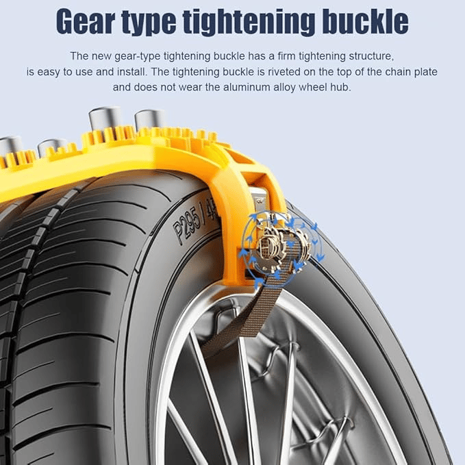 Fast installation—no tools, no jack. The gear-style buckle locks firmly and stays secure even on bumpy roads.